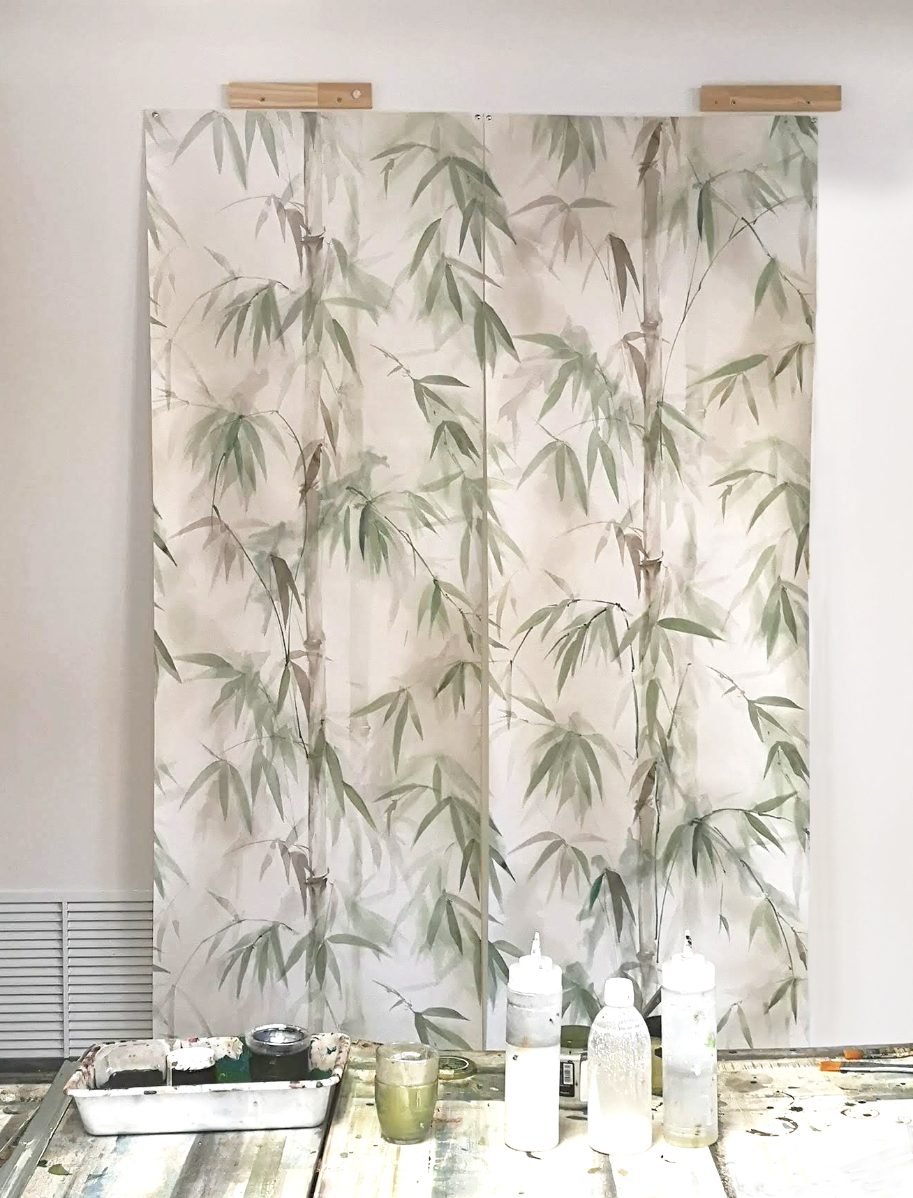 Papel pintado a mano, realizado con técnica mixta con tintas y acrílicos al agua.